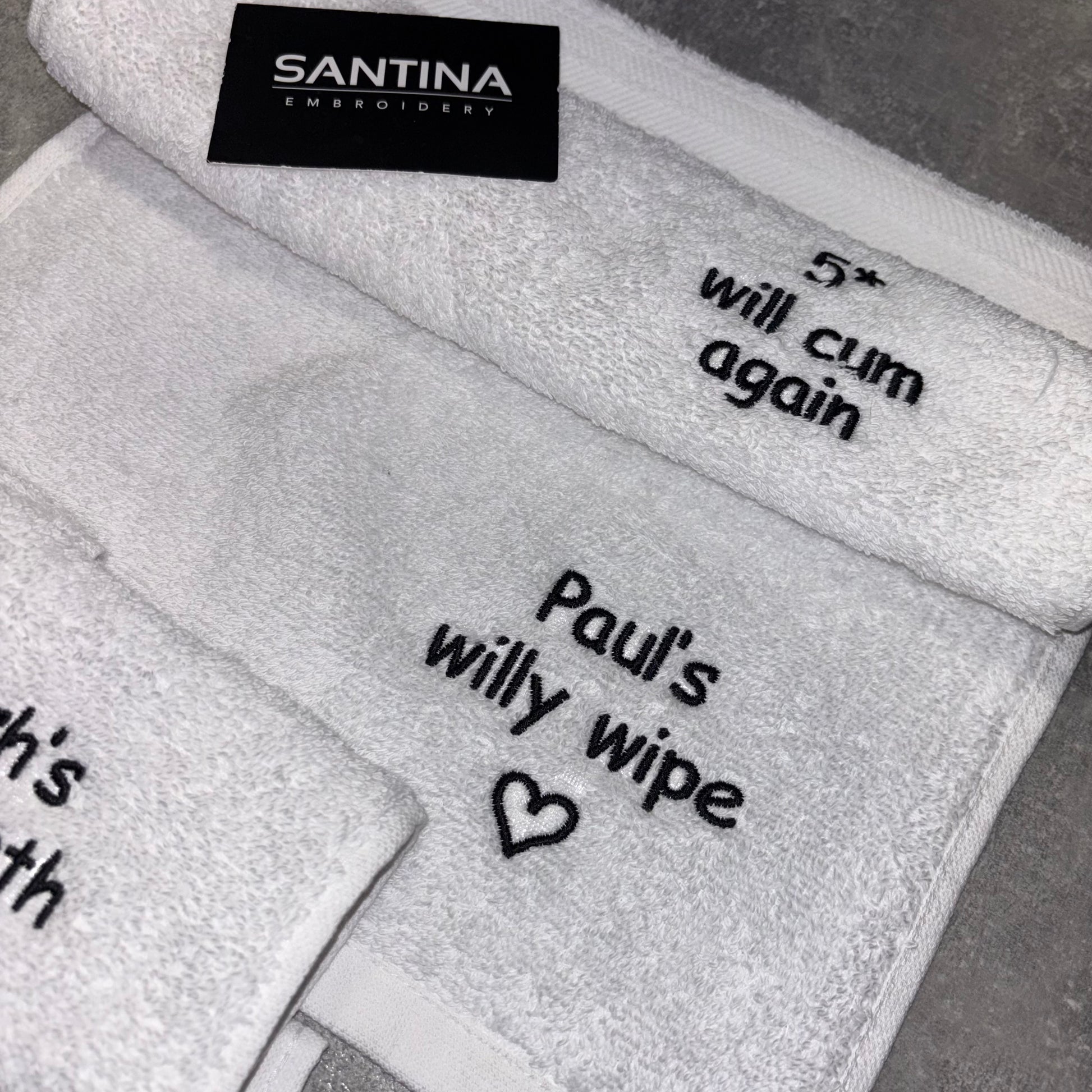 Stay fresh with this custom embroidered after-sex washcloth! A funny, naughty, and practical gift for couples, this kinky towel adds a playful touch to the bedroom. Perfect for anniversaries, bachelor/bachelorette parties, or just because! Personalize yours today for a unique, sexy gift.