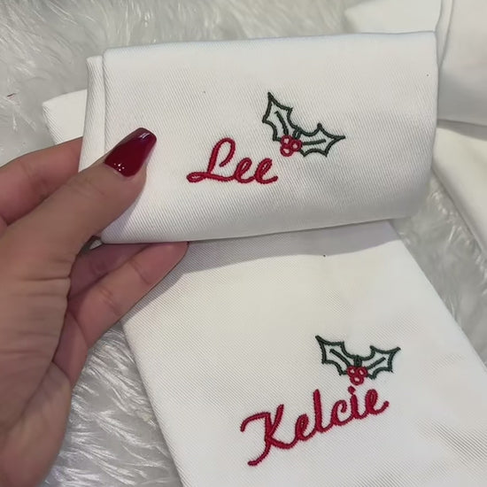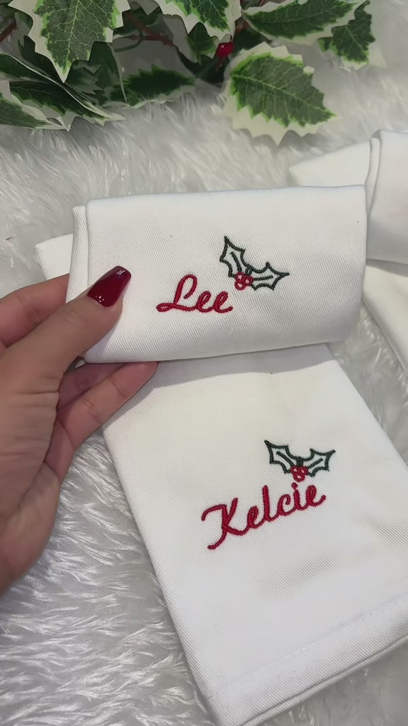 Each napkin is personalised with your chosen name and embroidered in your preferred thread colour, complete with a choice of two festive motifs — the classic holly or the elegant snowflake.