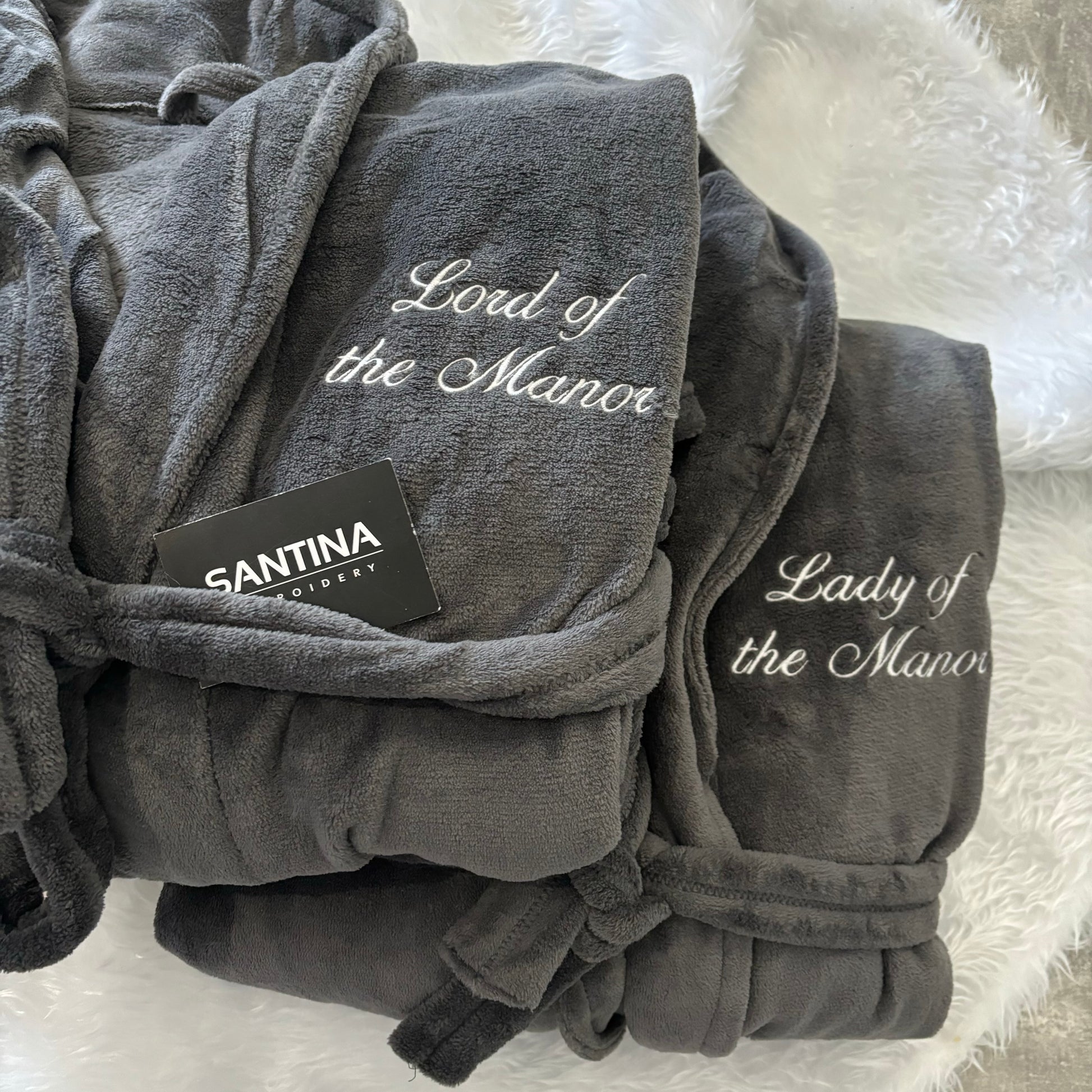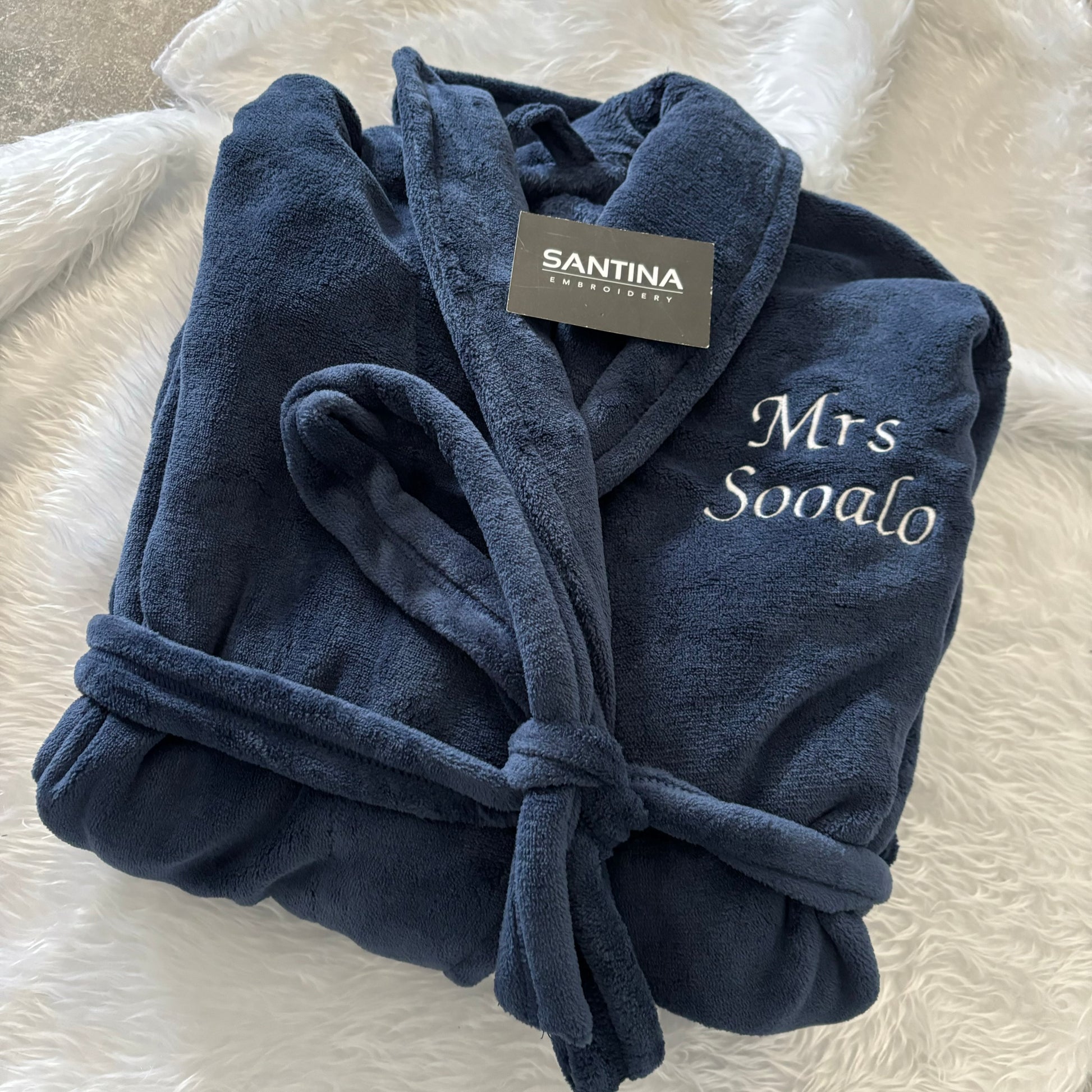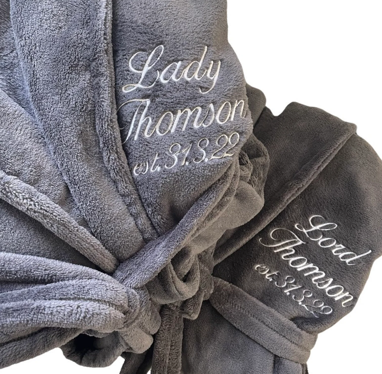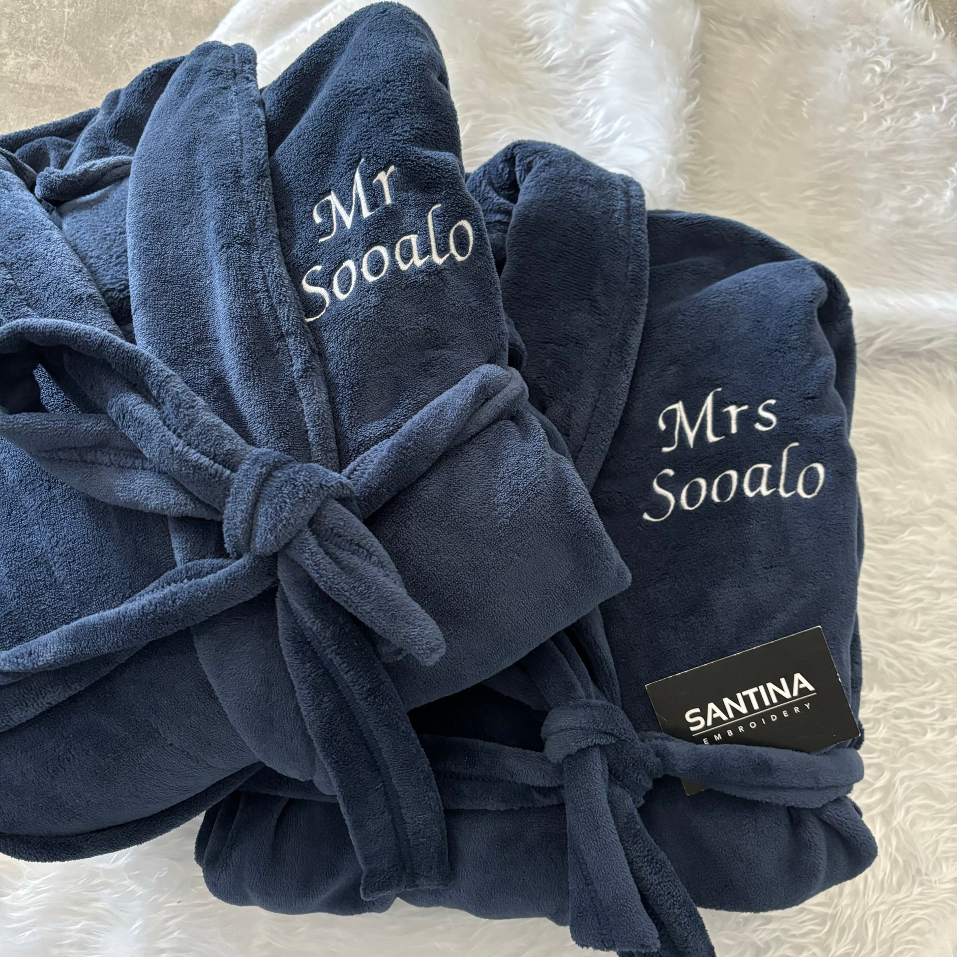 Single robe or a Set of two soft fleece bathrobes, available in a choice of black navy or grey, with your choice of font and choice of embroidery on the left chest.