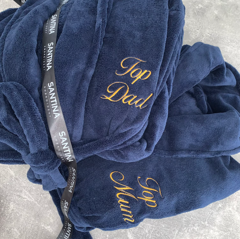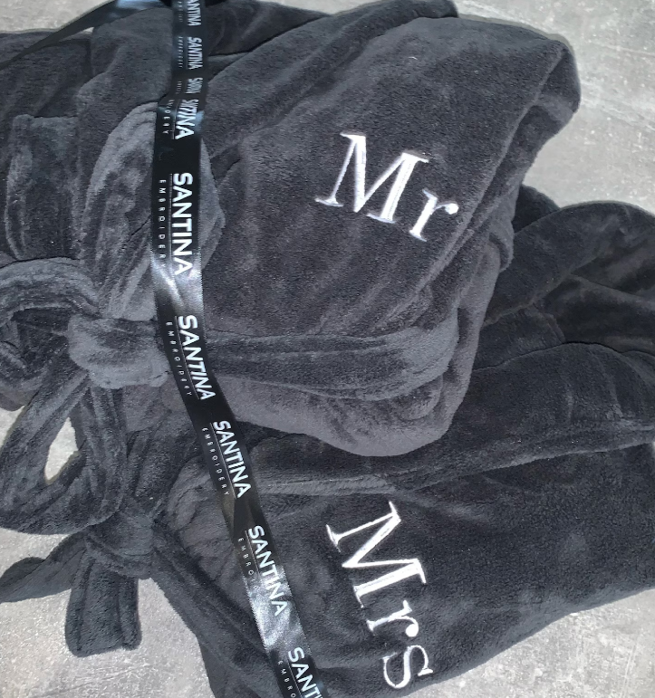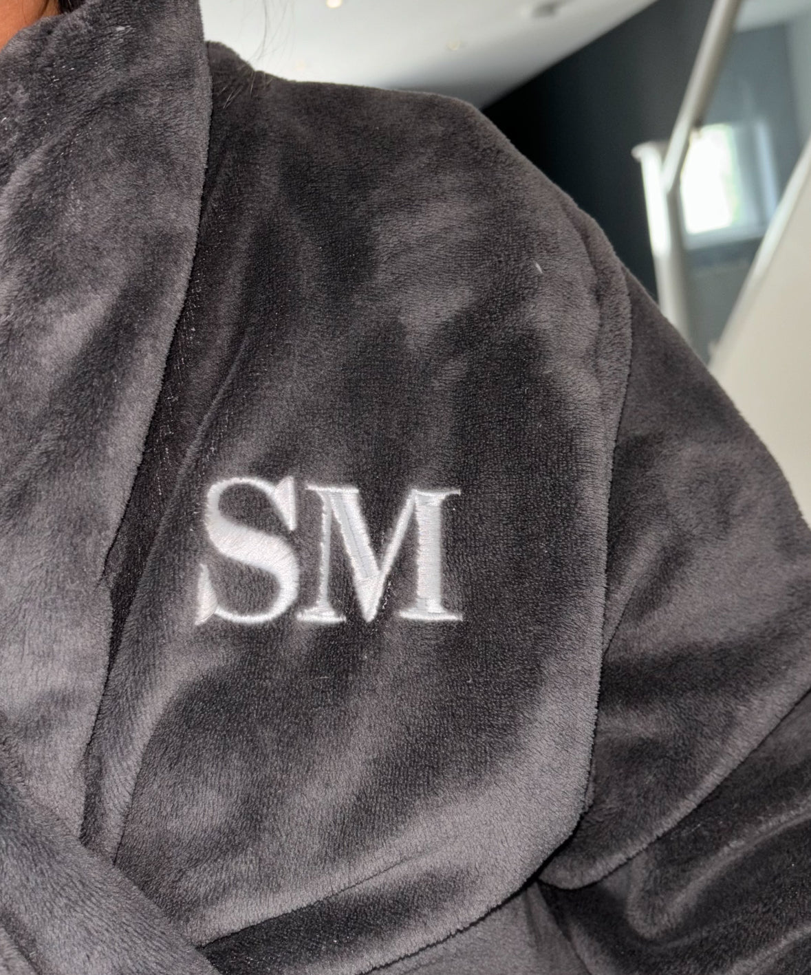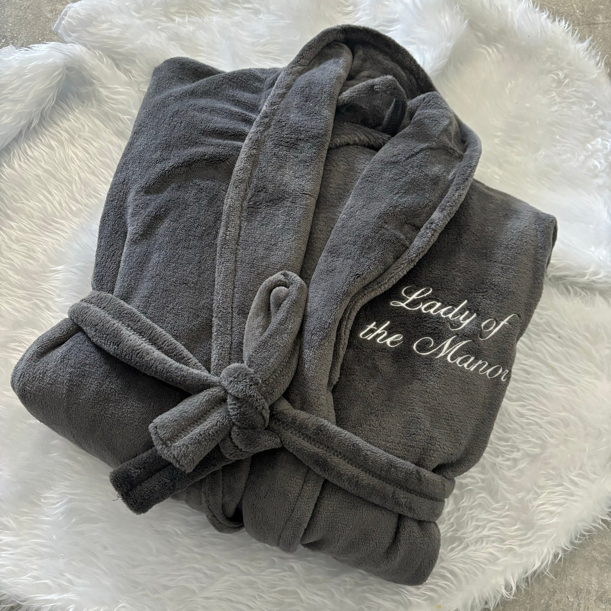 Single robe or a Set of two soft fleece bathrobes, available in a choice of black navy or grey, with your choice of font and choice of embroidery on the left chest.