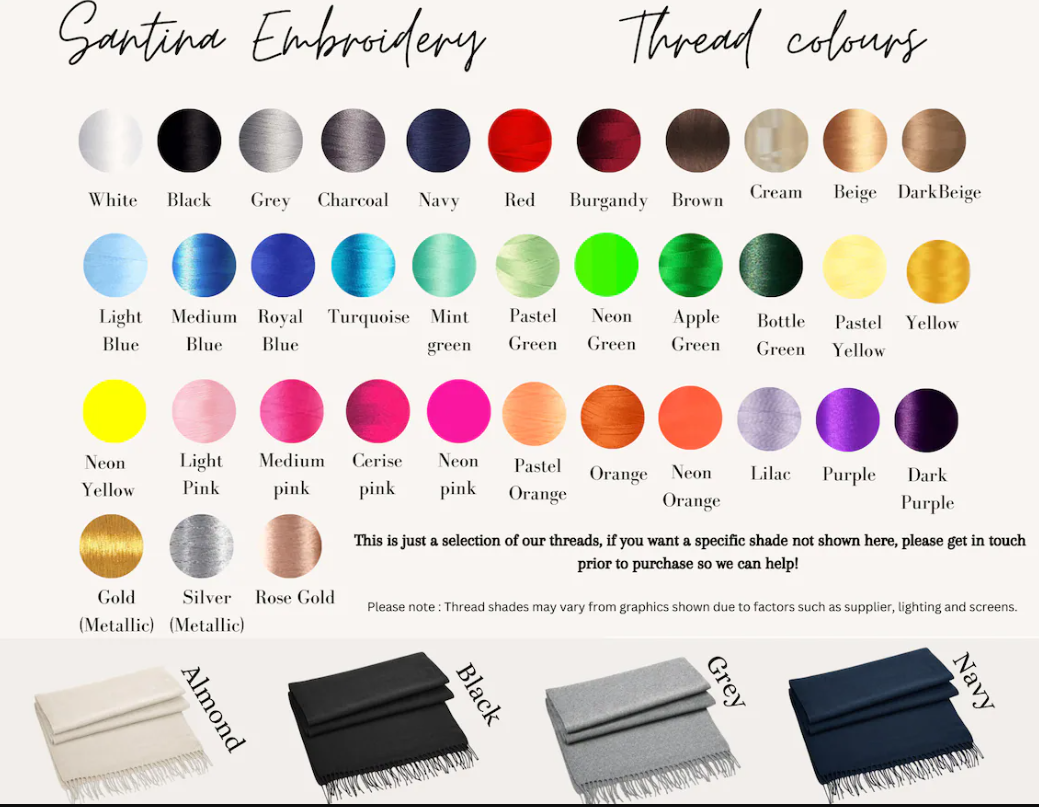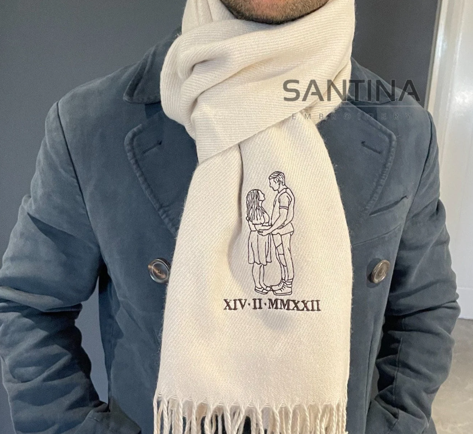 Introducing our personalised embroidered unisex scarves, the perfect gift idea for couples and families for all occasions. These scarves feature your own photo embroidered in a stylish outline style, adding a unique and personal touch, to celebare your favourite memories with loved ones or special occasions. Made with high-quality materials, our scarves are not only fashionable but also comfortable to wear and will keep you warm. Whether you're looking for a thoughtful present for a loved one or a special treat for yourself, our personalised embroidered scarves are sure to impress. Order yours today and make a lasting impression with this one-of-a-kind accessory.