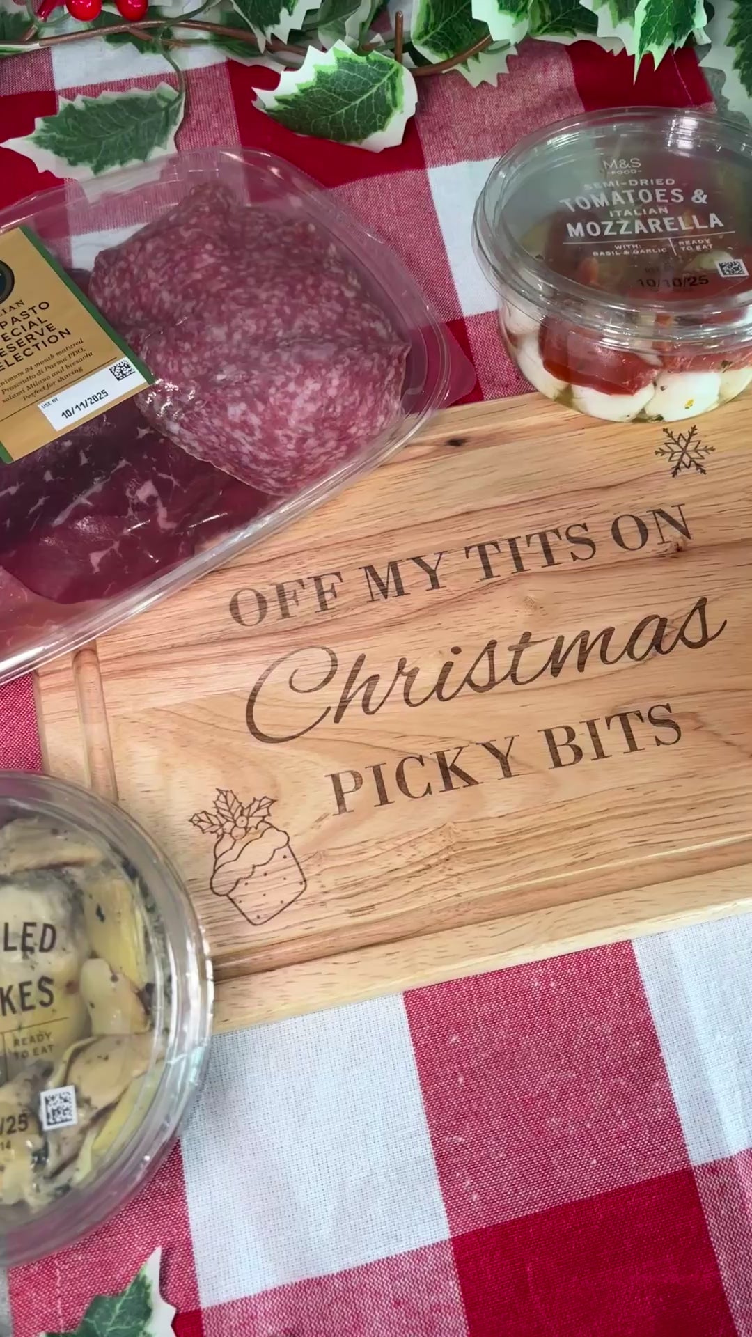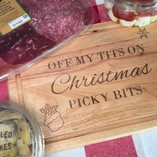 Bring a bit of humour into the kitchen with our NEW Christmas SPECIAL engraved rubberwood chopping board, featuring Our viral slogan with a Xmas twist “Off My Tits on Christmas Picky Bits”. 🍷🧀