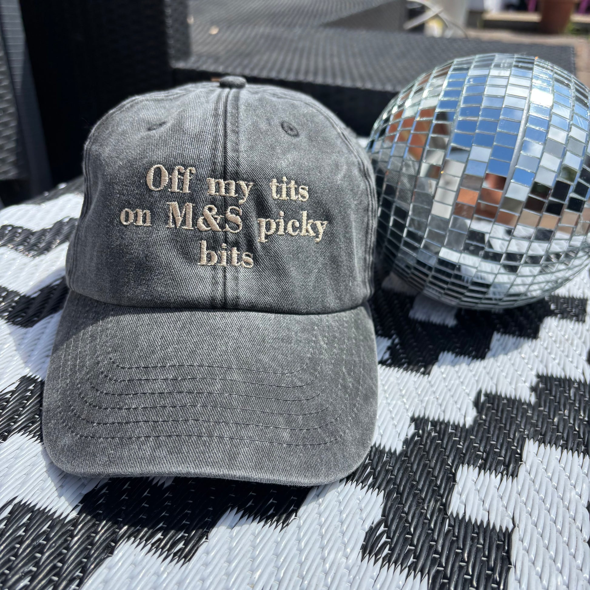 Off my tits on M&S picky bits custom embroidered slogan cap