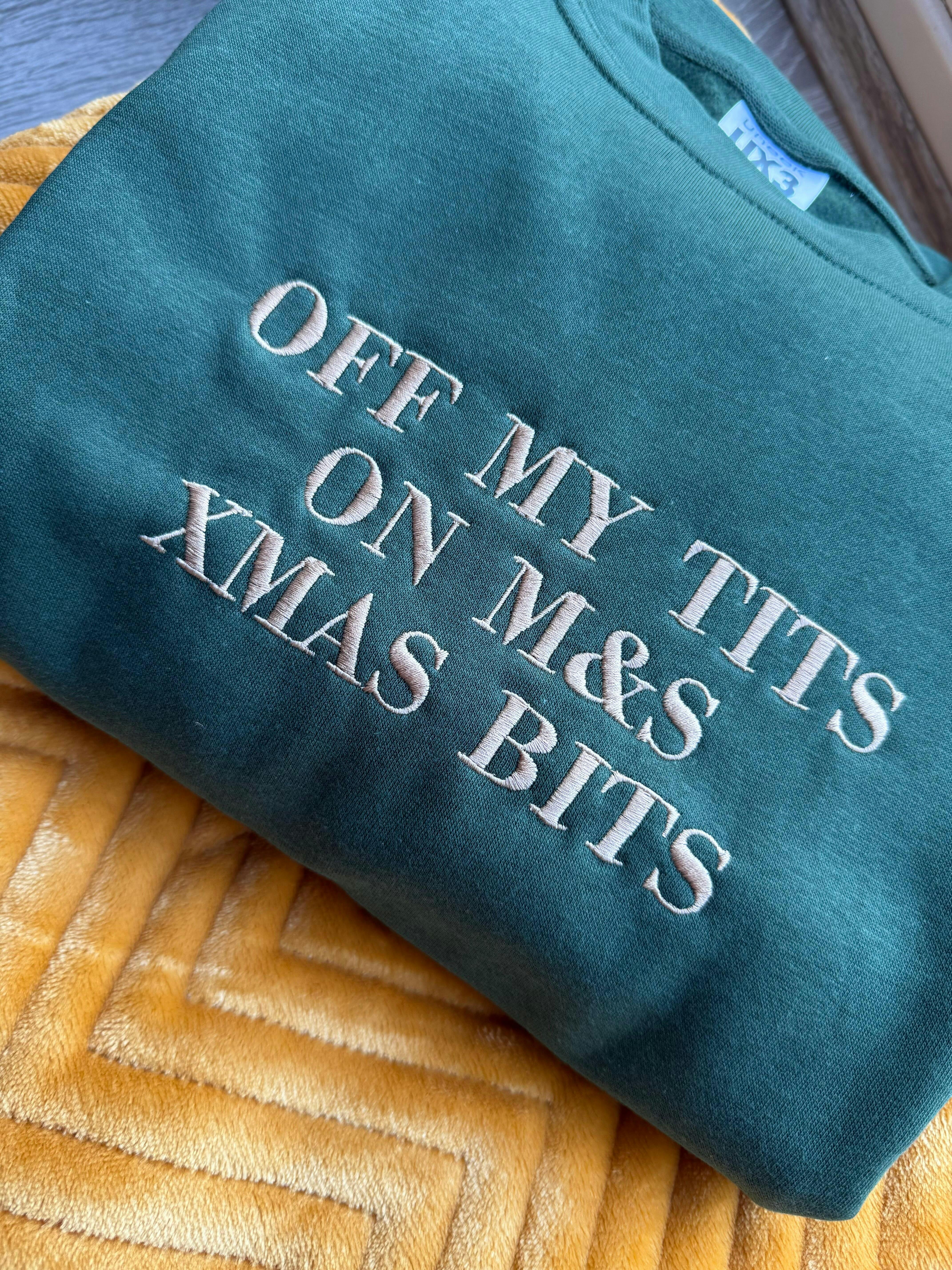 Off my tits on M&S XMAS bits, fun embroidered Christmas sweatshirt