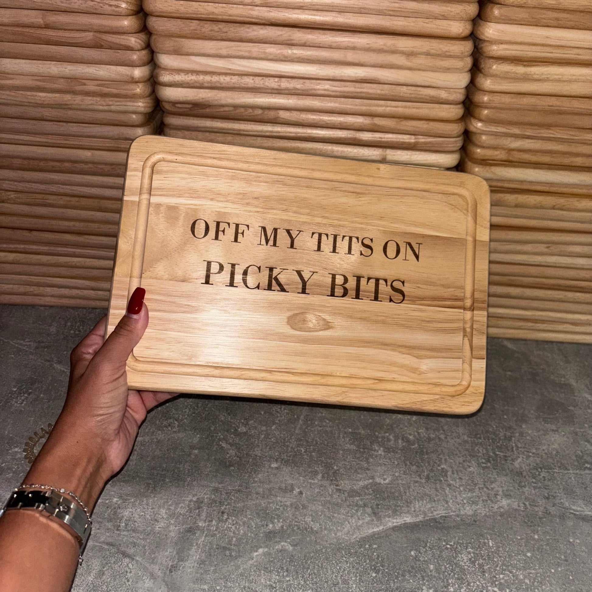 * Our latest product features a viral slogan ‘Off my tots on picky bits’! on a wooden chopping board. It's perfect for adding a touch of humor to your kitchen, and to serve up your favourite food and snacks with friends and family, or for your british nights in with your fave picky bits from your favourite supermarket!