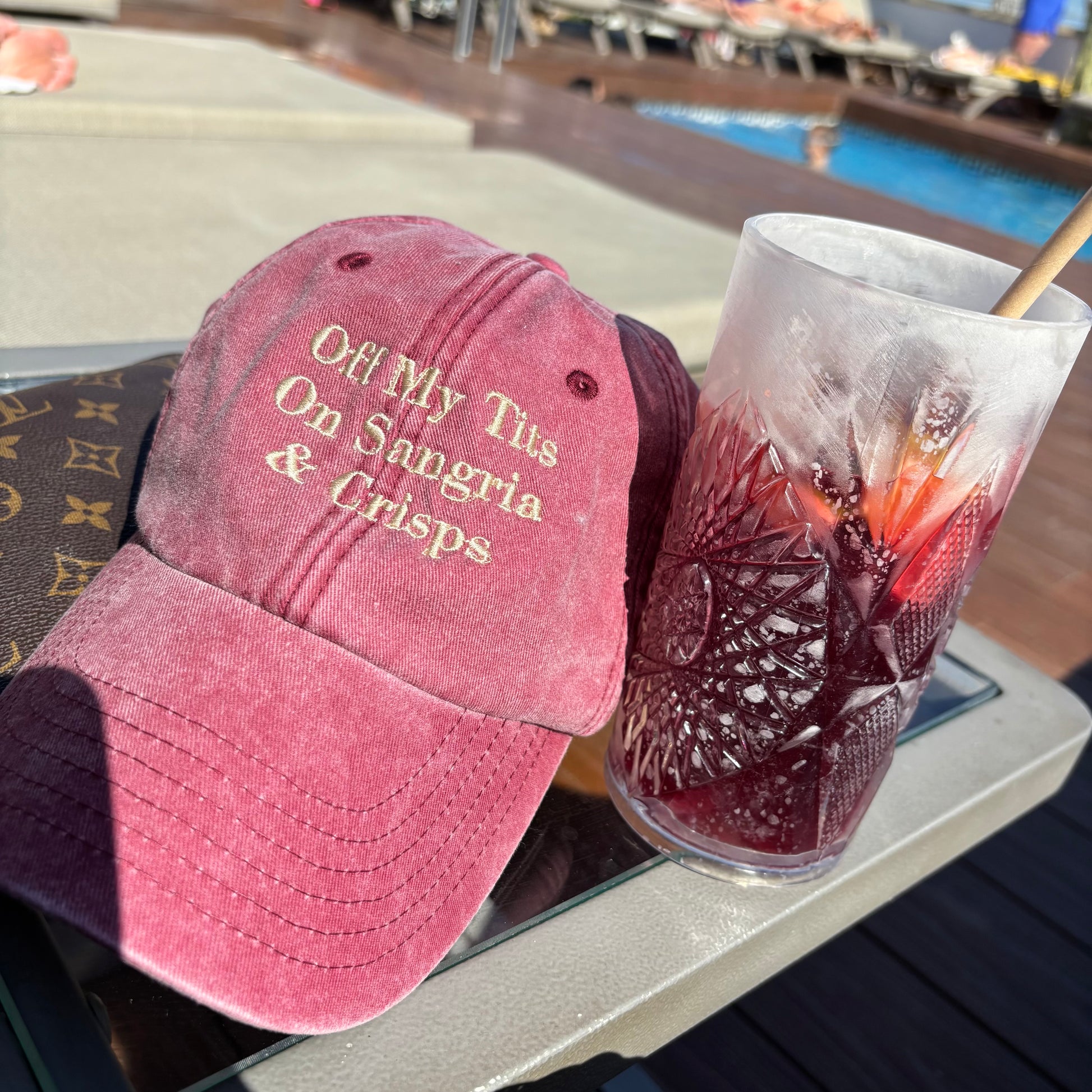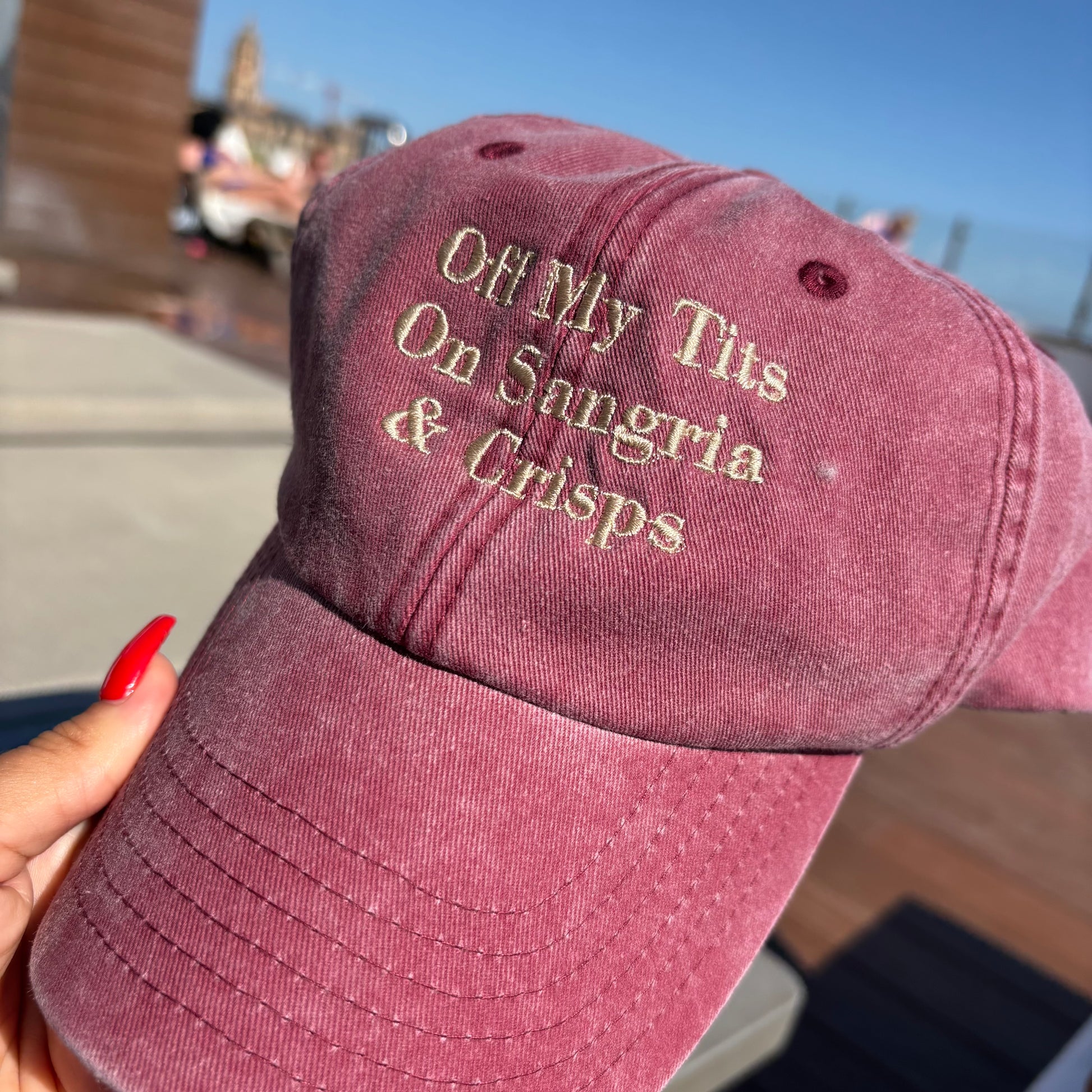 Off my tits on SANGRIA & CRISPS custom embroidered slogan cap