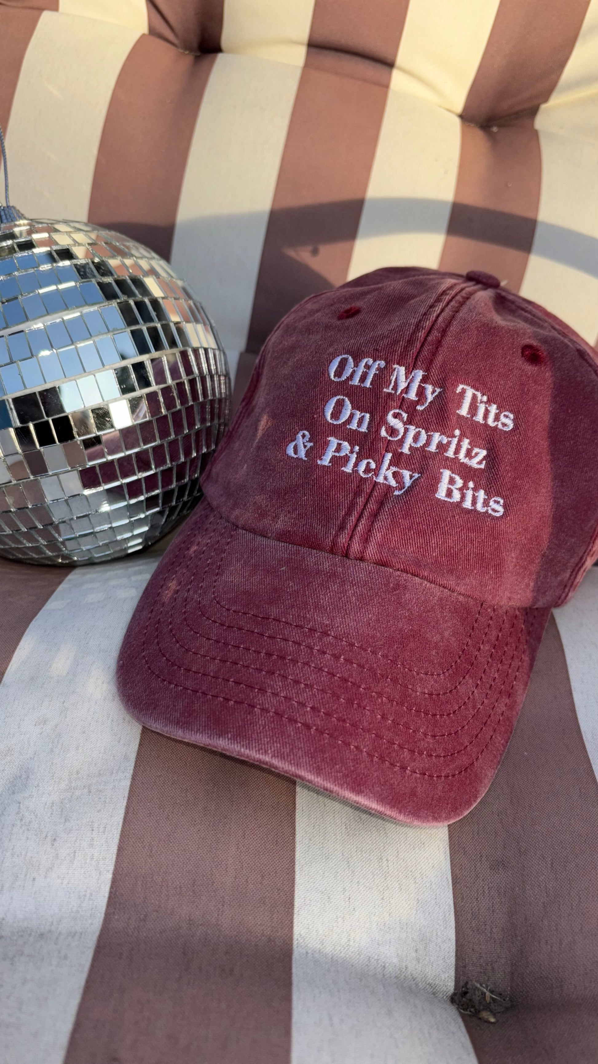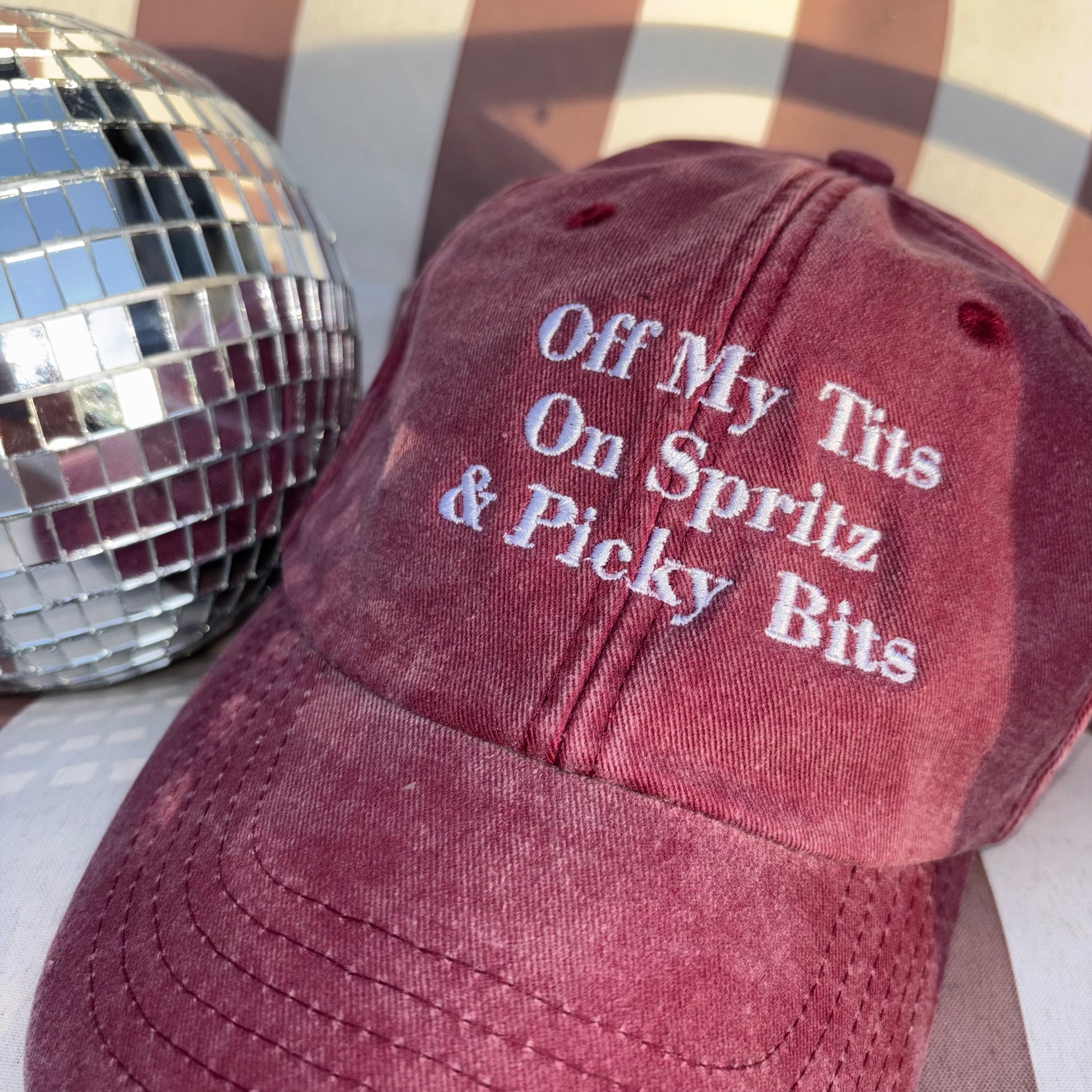 CUte unisex embroidered cap with ’off my tits on spritz & picky bits’ slogan