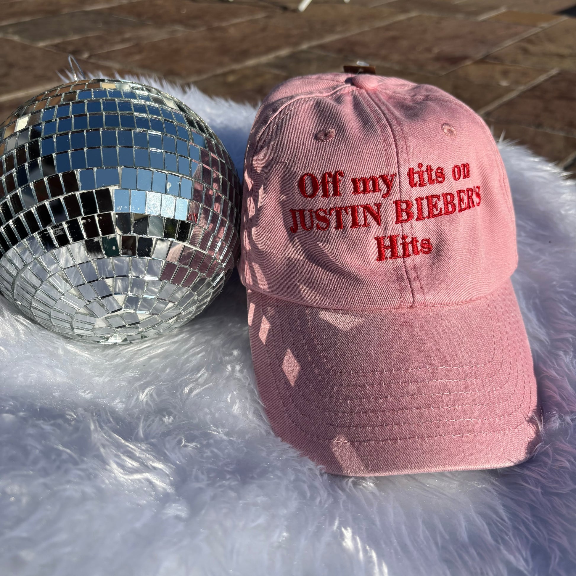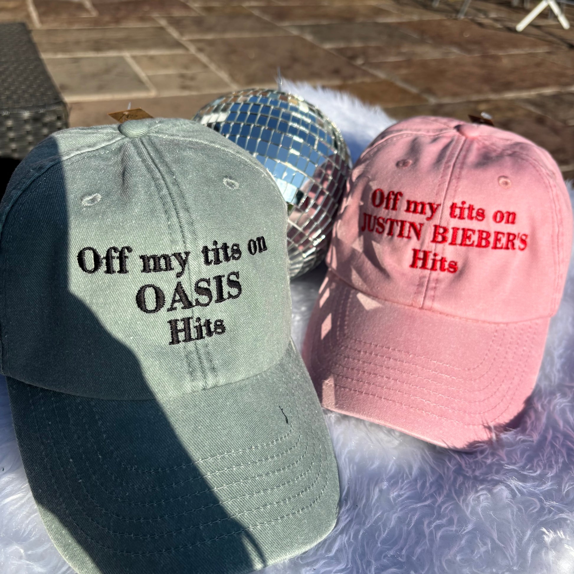 Off my tits on (YOUR FAVOURITE ARTIST) Hits. Custom embroidered cap 🧢 🎶